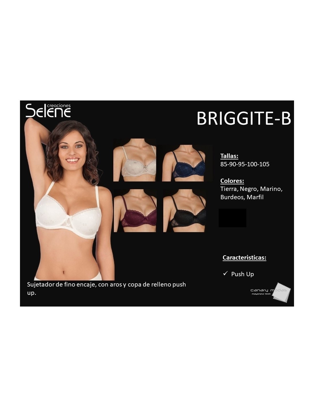 Sujetador con aros y copa de relleno, con tirantes. Elengante encaje. Tirante ancho con regulador. Cierre de 4 posiciones.