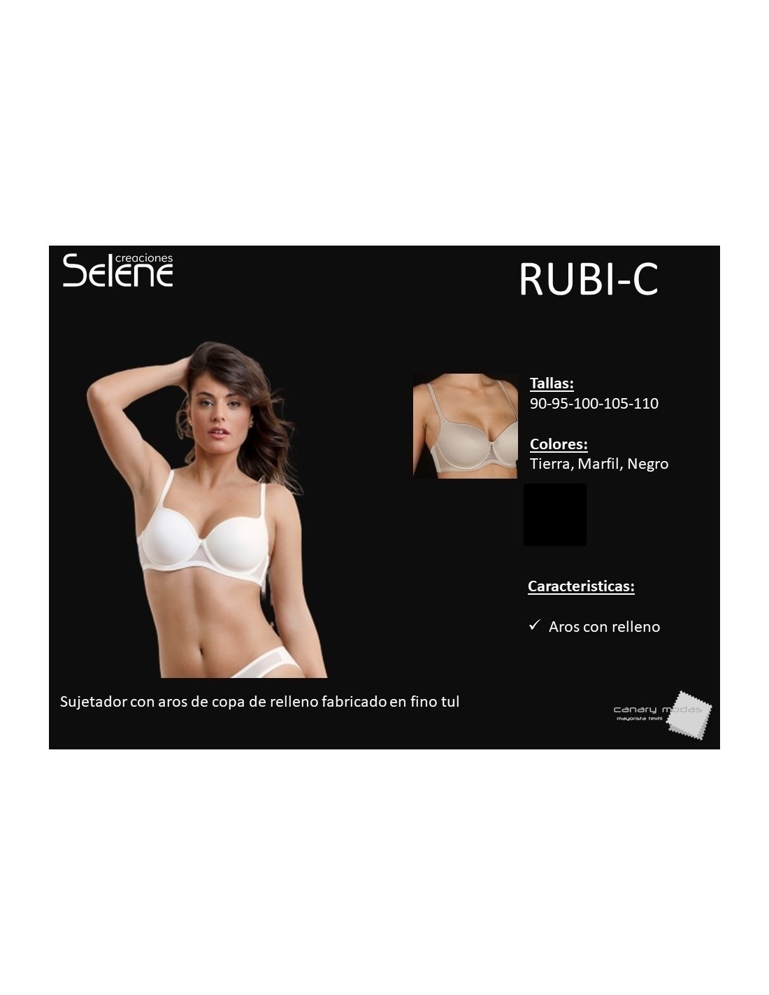 Sujetador con aros y copa de relleno, con tirantes. Elengante encaje. Tirante ancho con regulador. Cierre de 4 posiciones.
